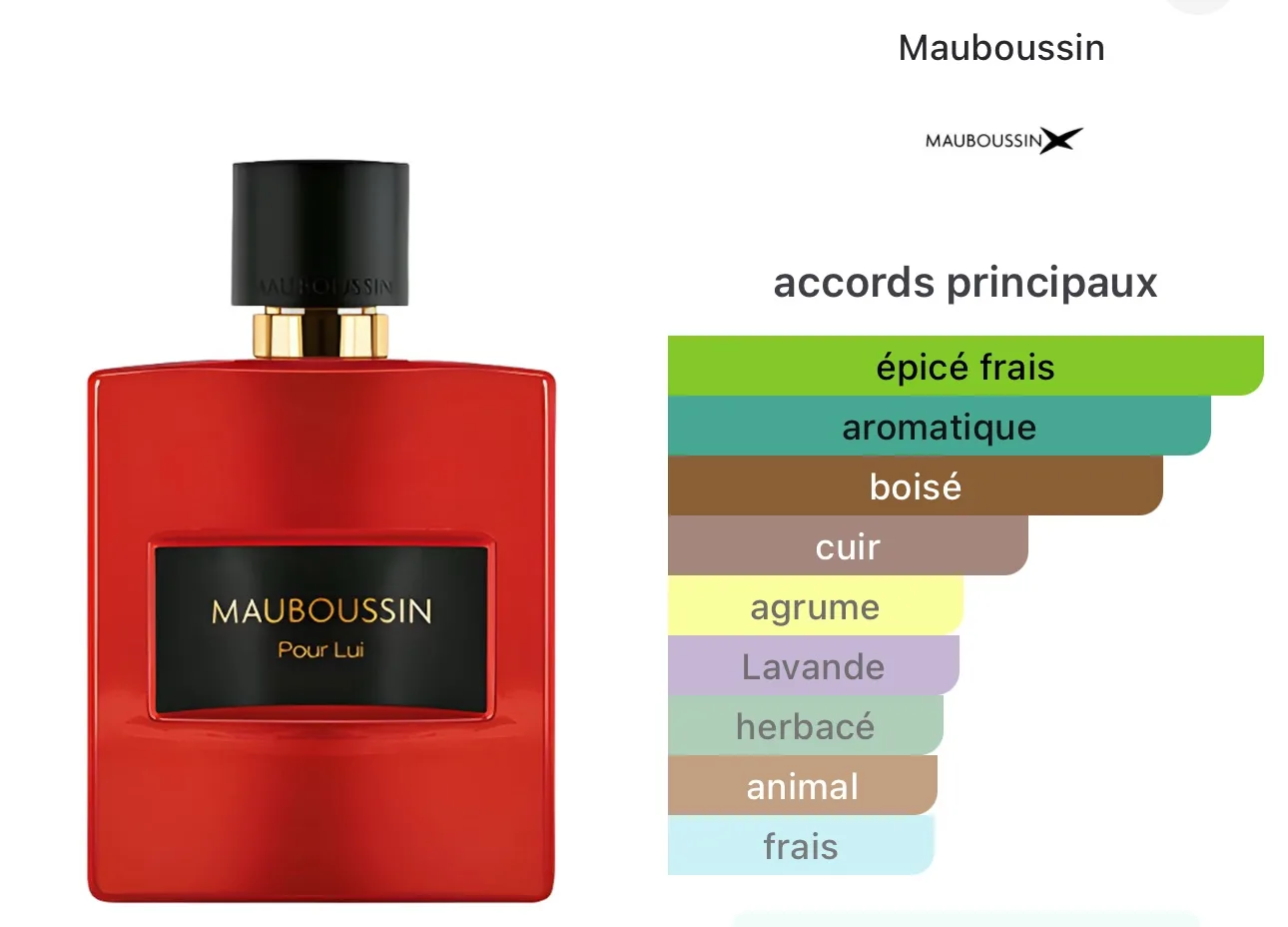 les notes de coeur sont Géranium, Lavande et Vétiver; les notes de fond sont Cuir, Bois de santal et Cèdre.